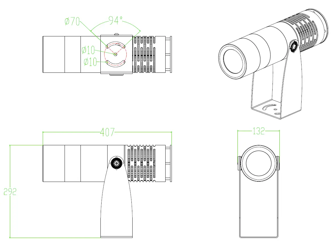Компактный корпус в виде трубы выполнен из прочного алюминиевого сплава и соответствует стандарту защиты IP68, обеспечивая высочайшую защиту от влаги и пыли. В конструкции применены виброустойчивые элементы, что гарантирует устойчивость к механическим воздействиям и порывистому ветру. Система крепления обеспечивает надёжную фиксацию проектора в различных условиях эксплуатации.